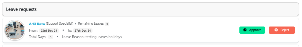 In this section, the Admin will receive leave requests from employees. The Admin has the authority to either approve or reject leave requests, providing reasons for their decision if necessary.