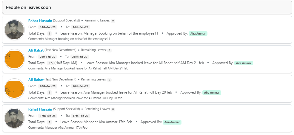 In this section, the Admin can view which employees are currently on leave and which Admin approved their leave requests.