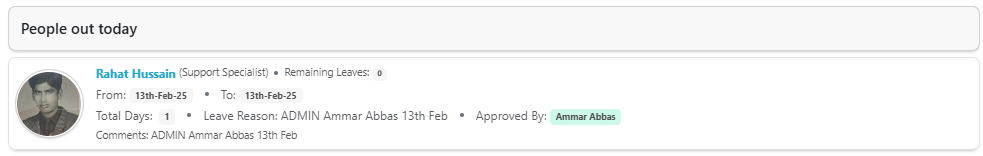 In this section, the Admin can access information regarding employees who are currently on leave and identify which Admin approved their leave requests.