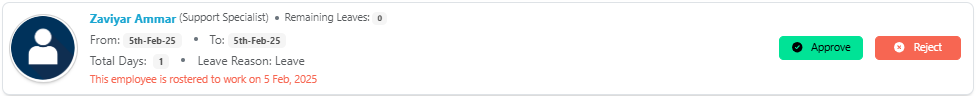 Note: Here, the user will see the Remaining Leaves, From Date, To Date, Total Days, and Leave Reason. Additionally, if the employee is rostered for the selected dates, it will also be indicated.
