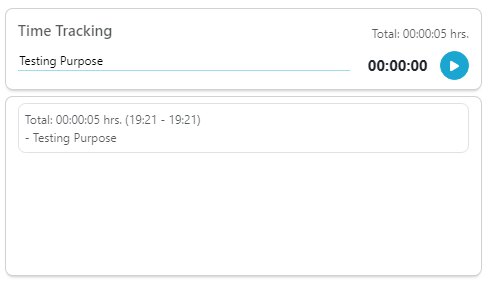 In this section, the Manager has the ability to track their time by clicking the play button, specifying the task they are currently working on. The Manager can also pause the time tracking, and upon pausing, the recorded time will be displayed below. Additionally, the total hours will be shown above the play button for easy reference.