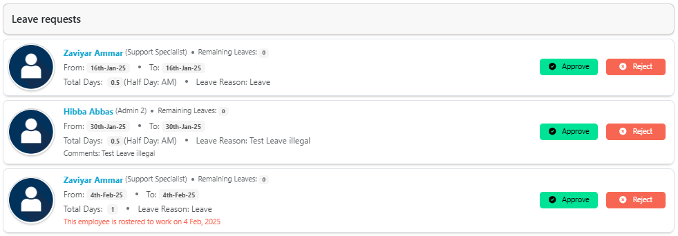 Note: Here, the user will see the Remaining Leaves, From Date, To Date, Total Days, and Leave Reason. Additionally, if the employee is rostered for the selected dates, it will also be indicated.