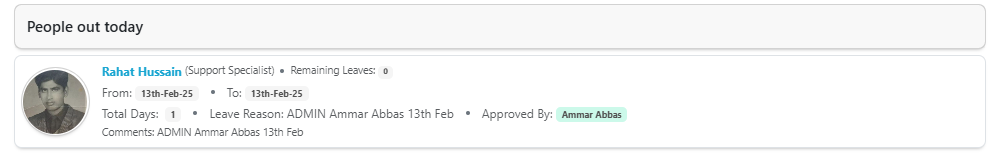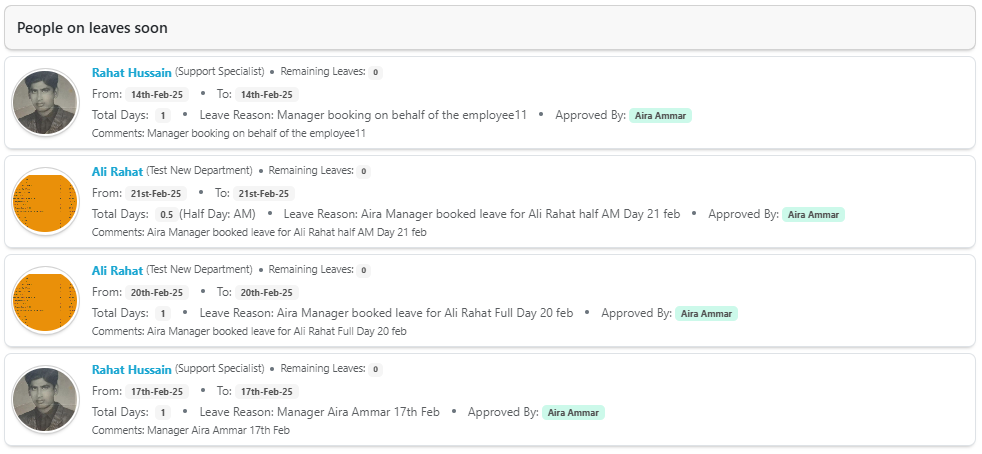 In this section, the Manager can view which employees are currently on leave and which Manager approved their leave requests.